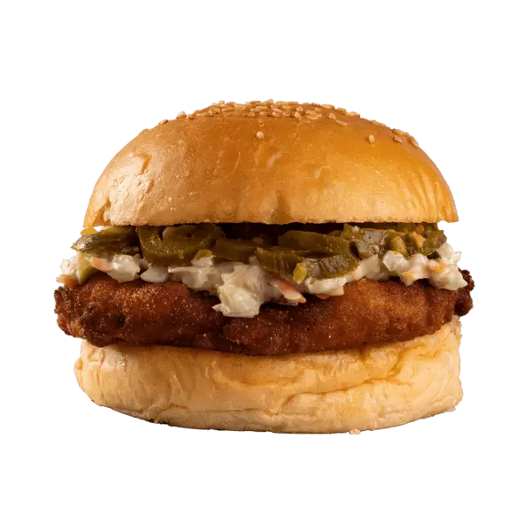 Pan de batata, pechuga de pollo empanizada de 210grs, ensalada de repollo y jalapeños rebozados