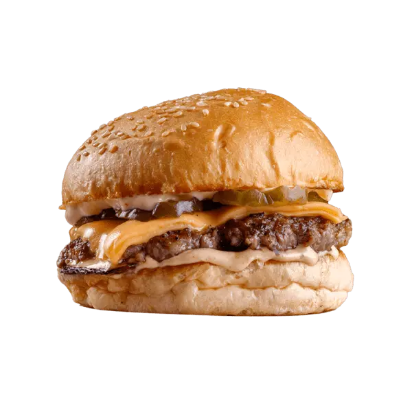 Pan de batata, carne de solomo de 100grs con cebolla grilladas,queso cheddar americano tipo facilistas KRAFT, pepinillos y salsa Bros