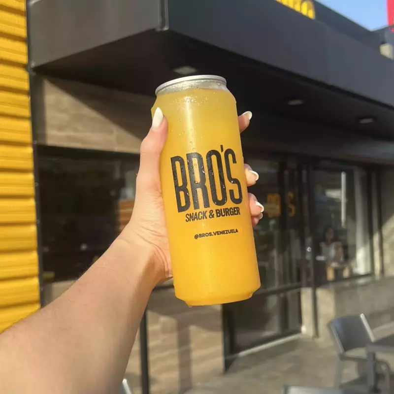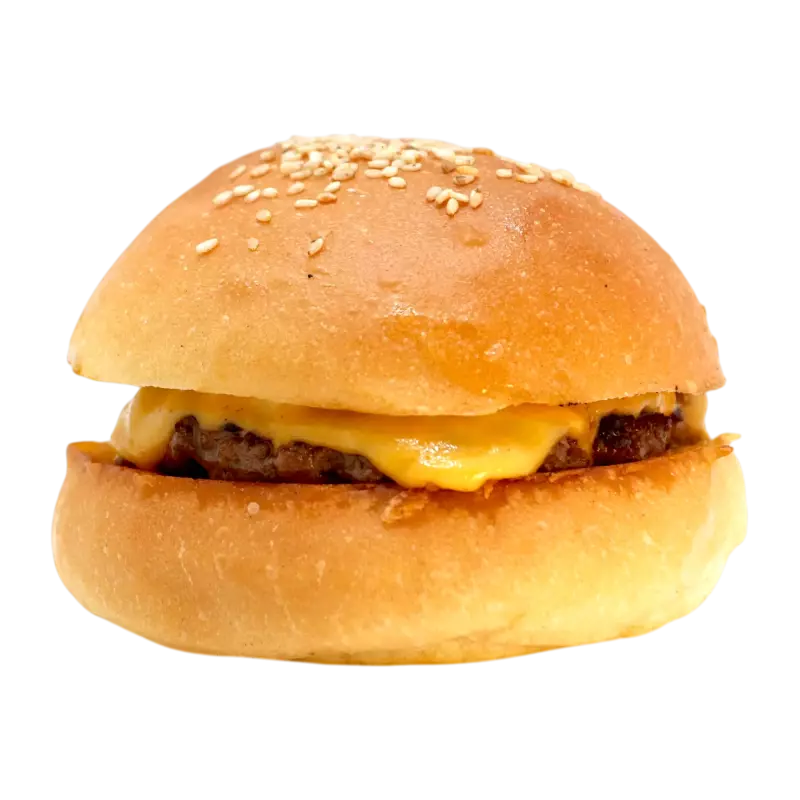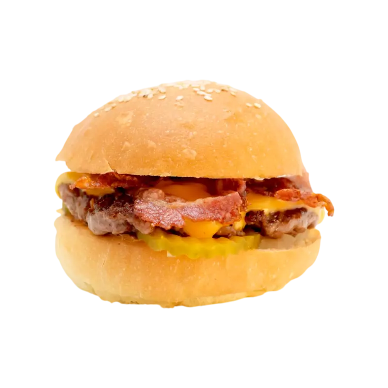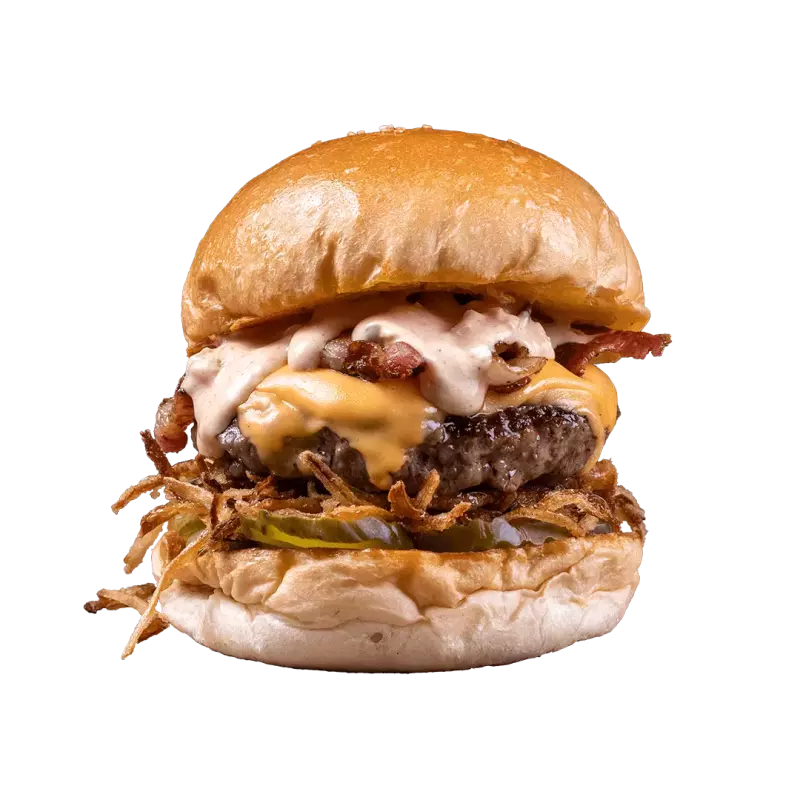 Pan de batata, carne de solomo de 180grs, queso cheddar, tocineta, cebollitas fritas, pepinillos y salsa Bros
