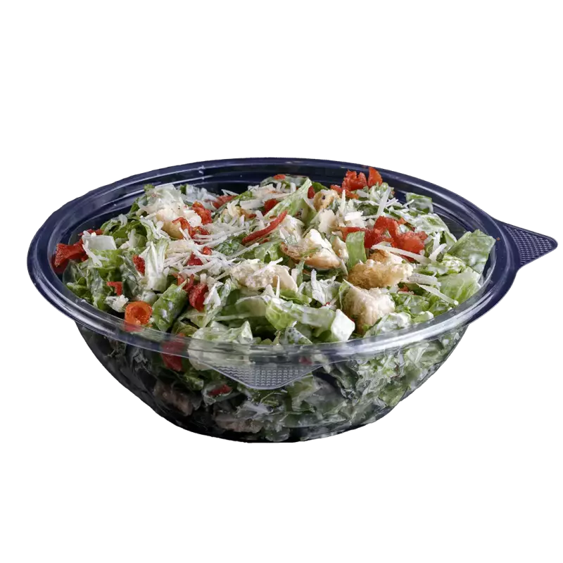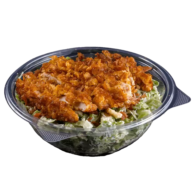 Crujiente lechuga con tocineta, pollo crispy, pan crouton, queso parmesano y aderezo de la casa