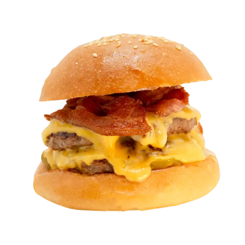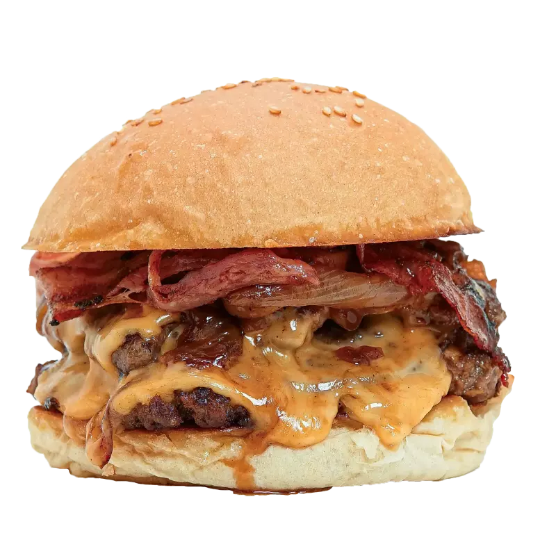 Pan de batata, doble carne de solomo de 100gr, doble queso cheddar, tocineta, pepinillos, cebollas y salsa Bros.