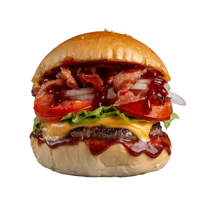 Pan de batata, carne de solomo de 180gr, queso cheddar, tocinetas, tomate, cebollas, lechuga y salsa BBQ