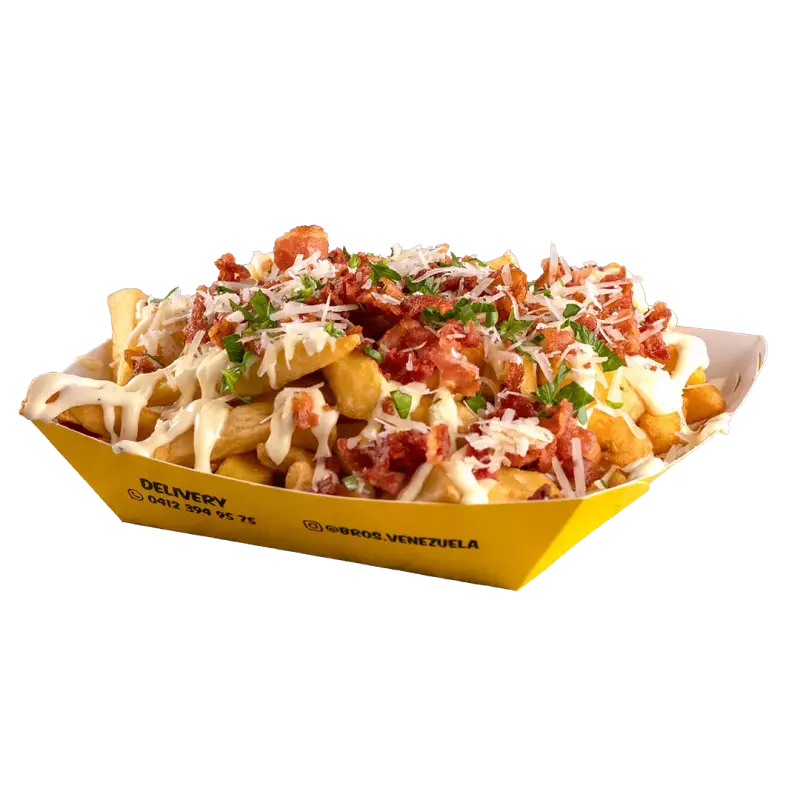 Ración de 200gr de papas fritas con aderezo de la casa, tocineta crujiente, queso parmesano y perejil