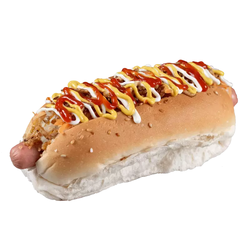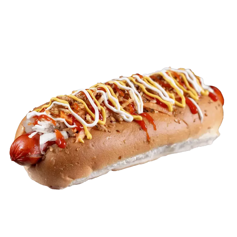 Hot dog clásico grande con salchicha Tovar, zanahoria, repollo, cebolla, mayonesa, ketchup y mostaza.