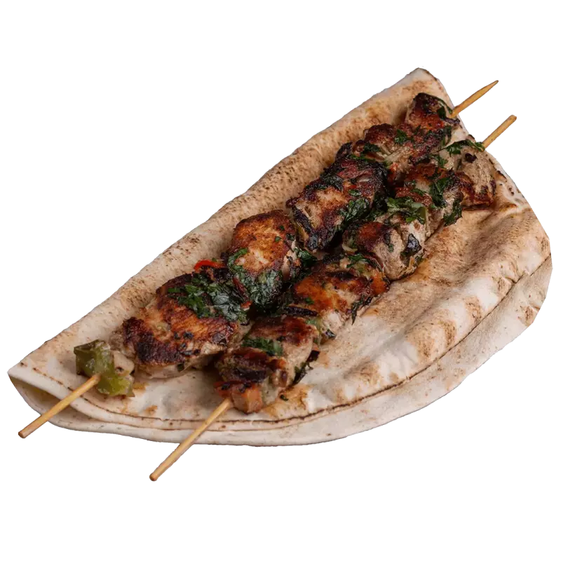Cortes de filete de pollo marinados con especies libanesas, ajo y perejil, acompañados de pan pita, taboule y crema de garbanzo