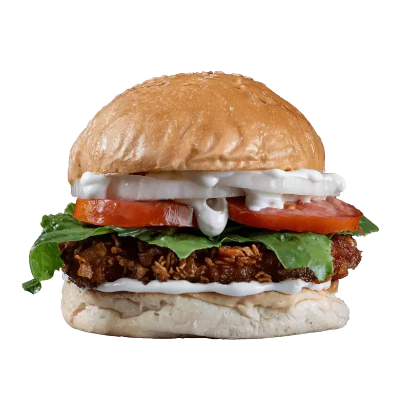 Pan de batata, pechuga de pollo crispy de 210grs, queso tipo facilistas KRAFT, pepinillos, cebolla, tomate, lechuga, salsa Bros