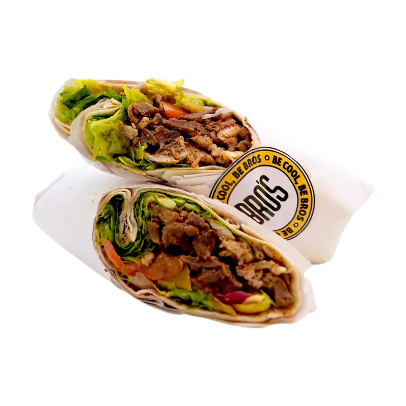 Clásico enrollado de pan árabe con lechuga, tomate, cebolla, pepinillos árabes, nabo, perejil, crema de garbanzo, ajo o ajonjolí