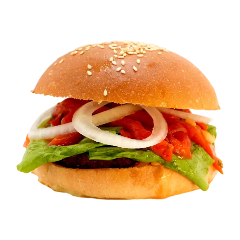 Pan de batata, falafel de 120gr, encurtido de pimentón, perejil, lechuga, cebolla, crema de garbanzo y crema de ajonjolí