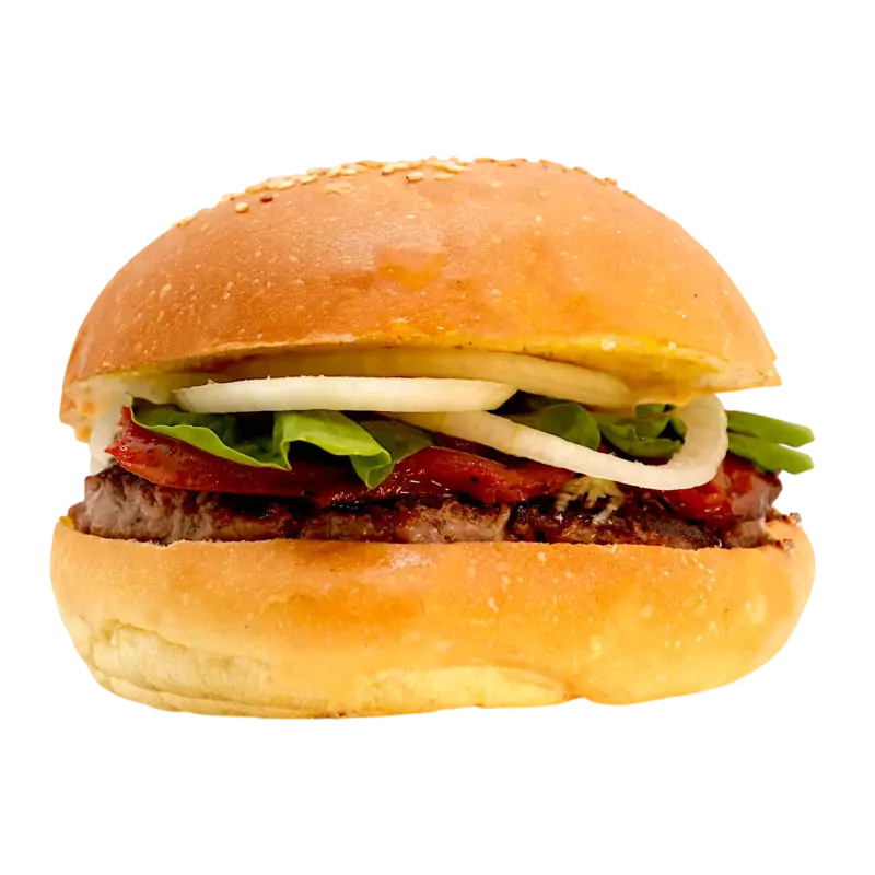 Pan de batata, carne de solomo de 100grs, queso cheddar, tocineta, pepinillos, cebolla y salsa Bros