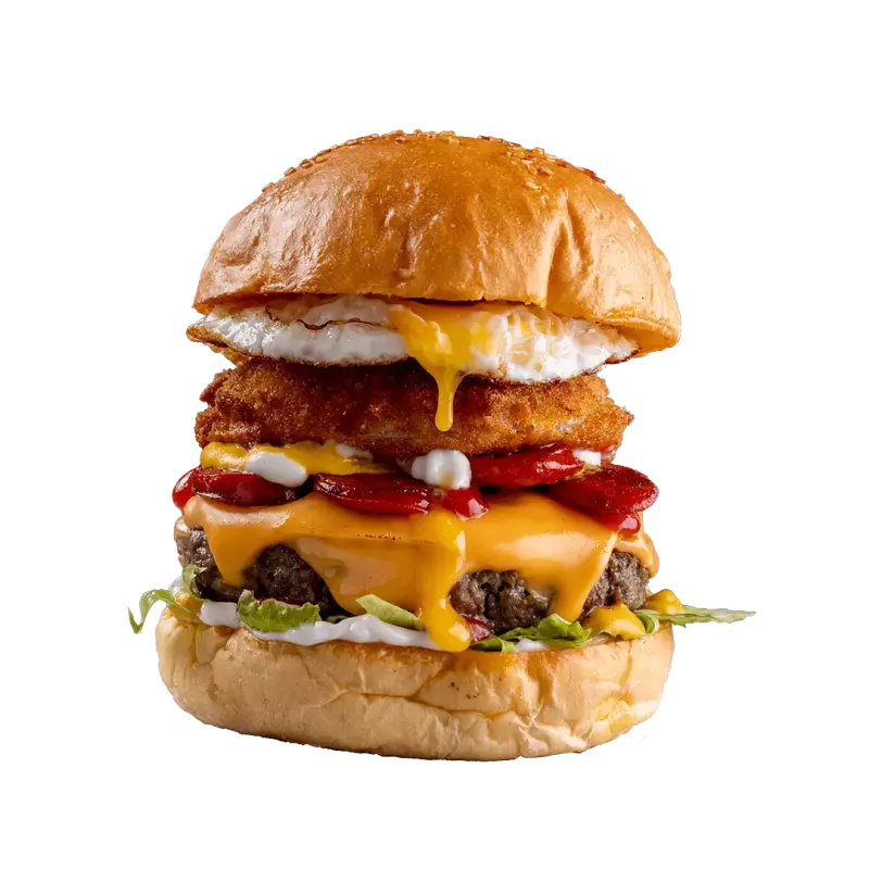 Pan de batata, carne de solomo de 200gr, queso cheddar, huevo, chorizo ahumado, aro de cebolla, lechuga y salsas clásicas