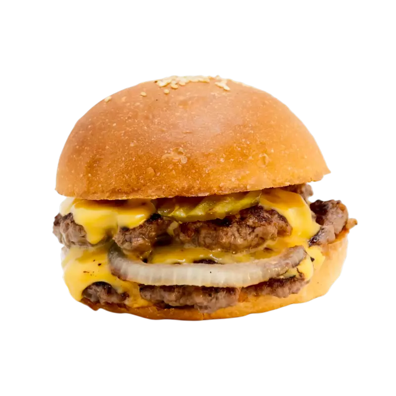Pan de batata, doble carne de solomo de 100grs cada una, doble queso cheddar americano tipo facilistas KRAFT, pepinillos, cebollas grilladas y salsa especial